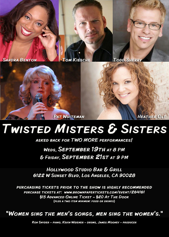 Twisted Misters & Sisters is where the “women sing the men’s songs, and the men sing the women’s.” It will be returning to the Hollywood Studio Bar & Grill for TWO MORE performances Sept 19th & 21st. The night stars: Sandra Benton, Heather Olt, Todd Sherry, Pat Whiteman, and myself. Ron Snyder will be on the baby grand, Kevin Widener will be on drums, and there is the possibility of another musician joining us. The event is again being produced by: James Mooney. Purchasing TICKETS prior the show is highly recommended. http://www.brownpapertickets.com/event/264161 and the Facebook event page for Twisted… is: https://www.facebook.com/events/315249641904682/